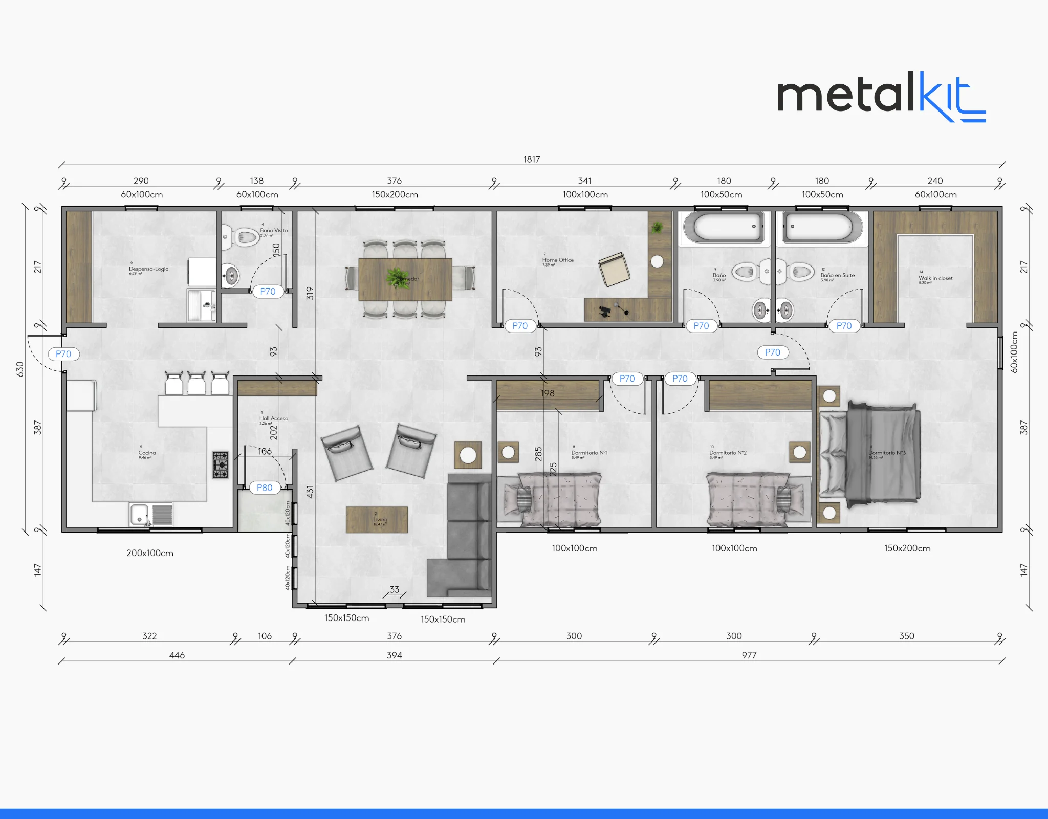 El Modelo C-120 de METALKIT tiene 3 dormitorios y 3 baños y ofrece espacios comunes mas amplios que el modelo C-123 (que tiene 2 dormitorios más).